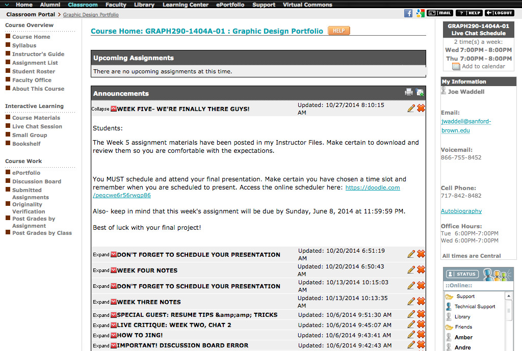 This screen displays the primary control center during your time in a selected program. Here you will access assignments, course materials, grades, and more. Get all of the information you need to be successful in class, including instructor contact information, up-to-date classroom announcements, and tech support. You may also communicate with your peers.