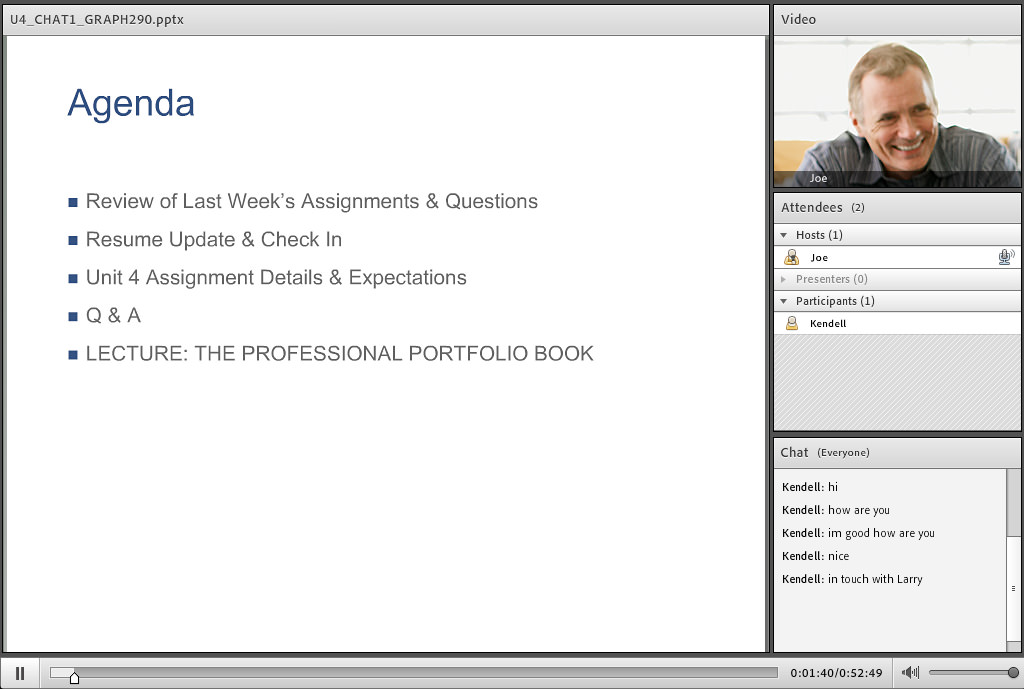 This is a window into your real-time classroom. You can view an in person video feed of your instructor and a live presentation lecture to assist in your learning. Immerse yourself in an interactive environment where you can communicate not only with your instructor but also you peers, just as you would in a physical classroom setting.